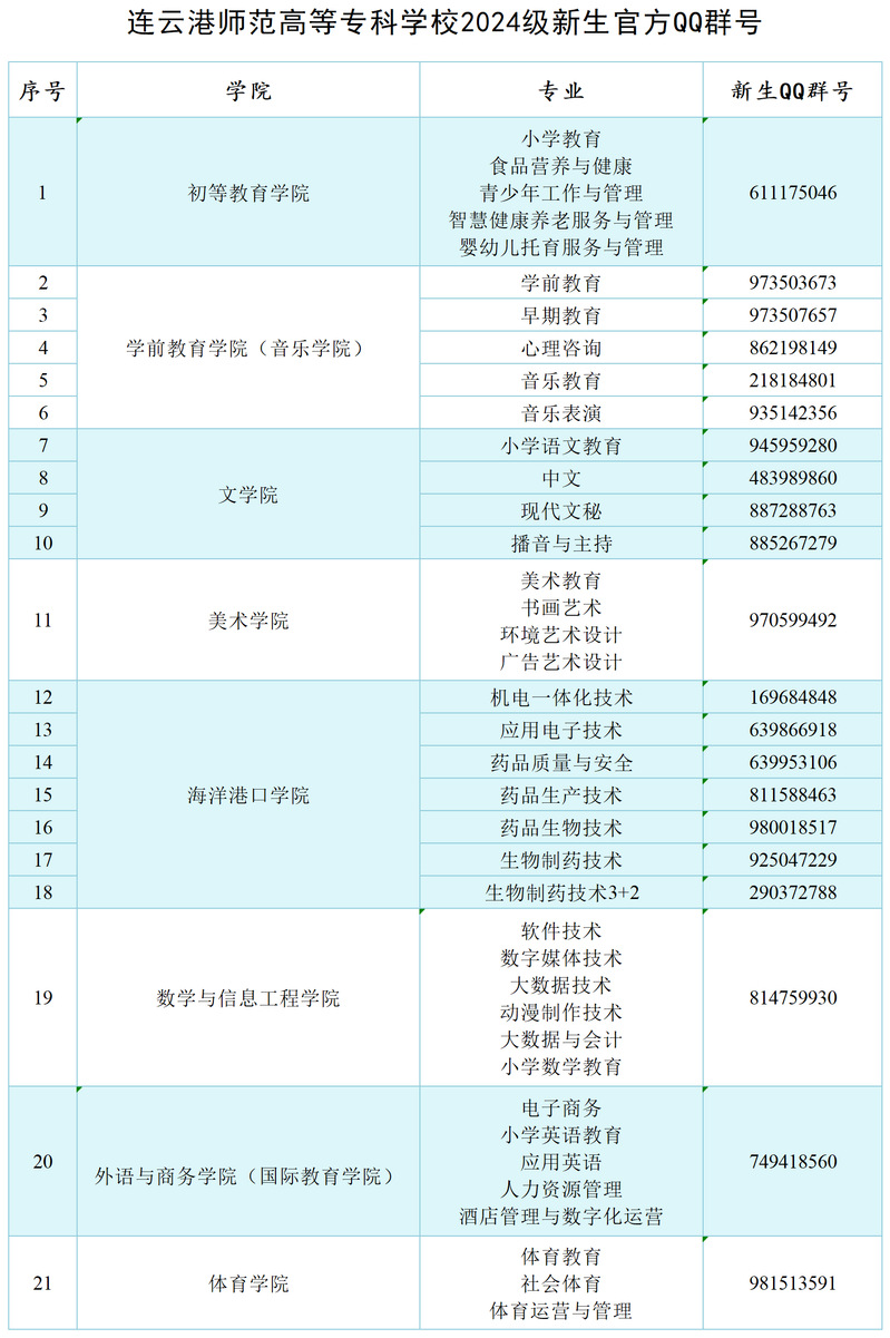 注意:本次公布的QQ群仅面向我校2024级新生开放,不提供对外宣传或咨询等服务。学校未设立任何咨询群,如需进行报考咨询,可拨打学校招生咨询电话:0518-85986111,0518-85986168。